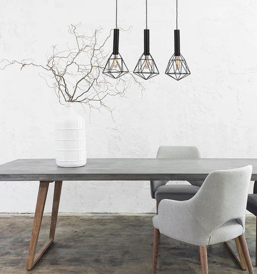 View full detailsInterior multiple pendant light Material: powder coated iron Shape: diamond cage bar base Lamp holder: 3xE27 (Max.72W) Globe not included For indo...